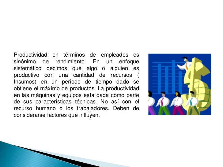 - 2. Productividad en términos de empleados es sinónimo de rendimiento. En un enfoque sistemático decimos que algo o alguien es productivo con una cantidad de recursos (Insumos) en un periodo de tiempo dado se obtiene el máximo de productos. La productividad en las máquinas y equipos esta dada como parte de sus características técnicas. No así con el recurso humano o los trabajadores. Deben de considerarse factores que influyen.
