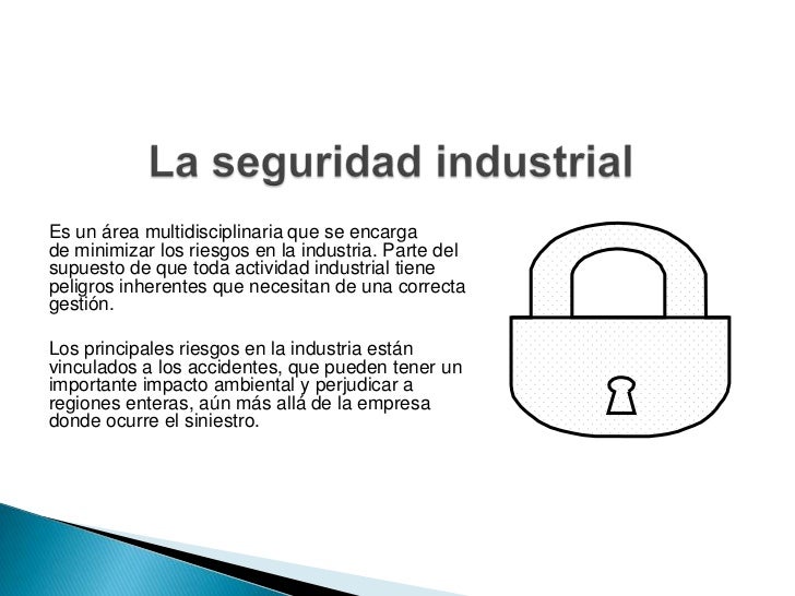 - 3. Es un área multidisciplinaria que se encarga de minimizar los riesgos en la industria. Parte del supuesto de que toda actividad industrial tiene peligros inherentes que necesitan de una correcta gestión.Los principales riesgos en la industria están vinculados a los accidentes, que pueden tener un importante impacto ambiental y perjudicar a regiones enteras, aún más allá de la empresa donde ocurre el siniestro.