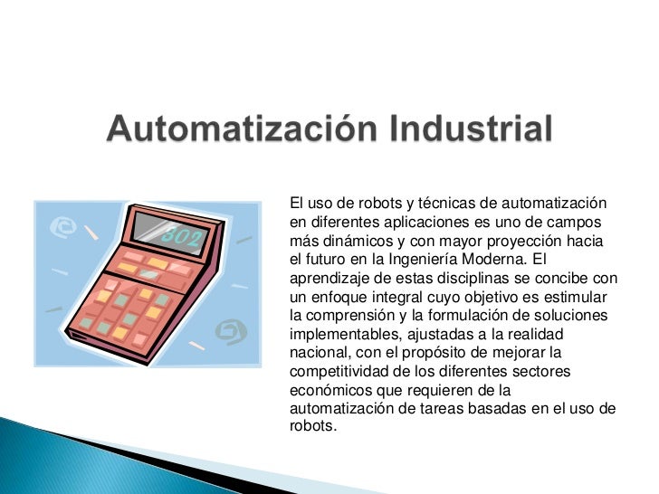 - 5. El uso de robots y técnicas de automatización en diferentes aplicaciones es uno de campos más dinámicos y con mayor proyección hacia el futuro en la Ingeniería Moderna. El aprendizaje de estas disciplinas se concibe con un enfoque integral cuyo objetivo es estimularla comprensión y la formulación de solucione simple mentables, ajustadas a la realidad nacional, con el propósito de mejorar la competitividad de los diferentes sectores económicos que requieren de la automatización de tareas basadas en el uso de robots.