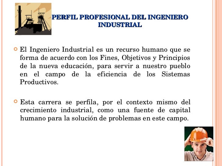 - El Ingeniero Industrial es un recurso humano que se forma de acuerdo con los Fines, Objetivos y Principios de la nueva educación, para servir a nuestro pueblo en el campo de la eficiencia de los Sistemas Productivos.
