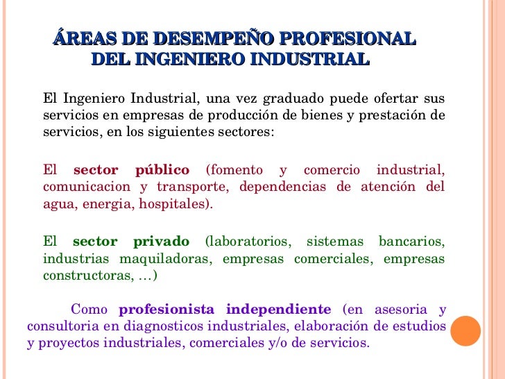 - El Ingeniero Industrial, una vez graduado puede ofertar sus servicios en empresas de producción de bienes y prestación de servicios, en los siguientes sectores: