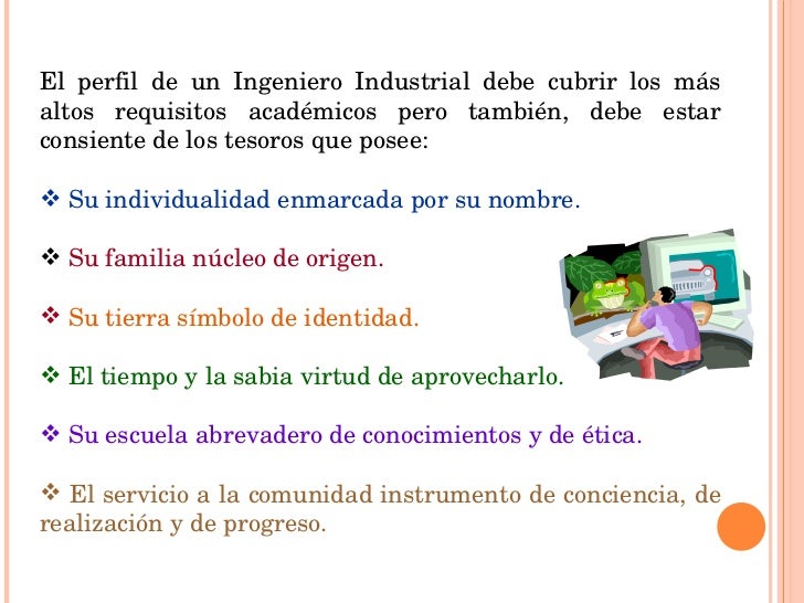 - El perfil de un Ingeniero Industrial debe cubrir los más altos requisitos académicos pero también, debe estar consiente de los tesoros que posee: